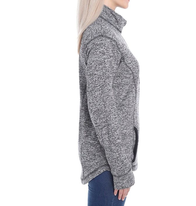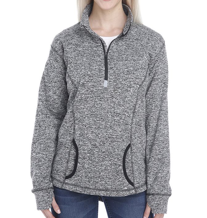 This stylish J America Women's Cosmic Quarter-Zip Pullover is a must have in your closet. Made of 100% spun polyester fleck fleece, this quarter-zip provides style along with comfort. Thumbholes on the cuffs will keep your hands warm on those cold days. All that's missing now is your design!