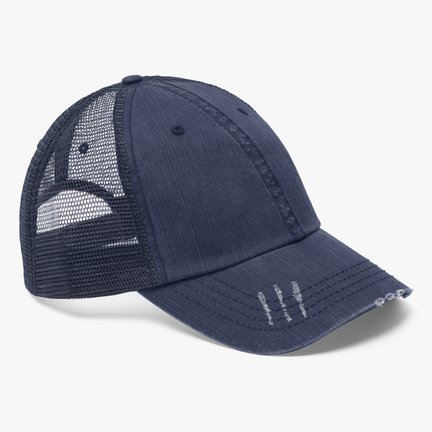 Distressed visor and frayed edges give a vintage feel and look