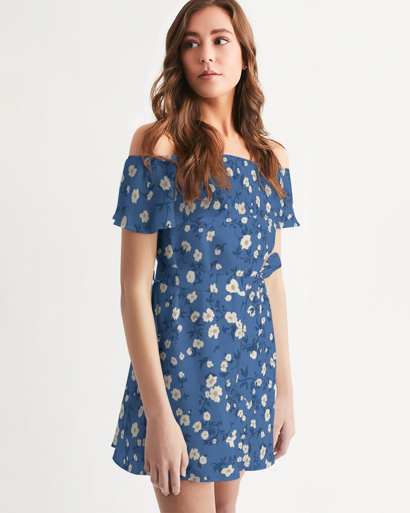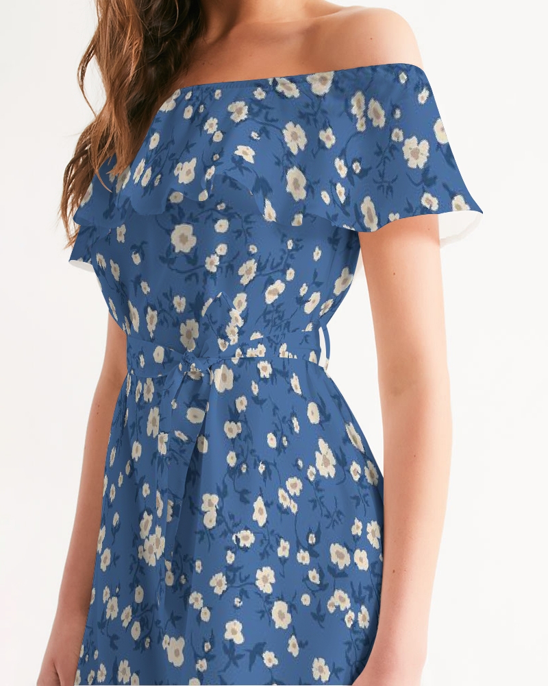 With a beautifully ruffled neckline, you will look effortless in our Women's Off-Shoulder Dress. Sheer chiffon is adorned with smocked detailing, a ruffled hem, and topped off with an adjustable belted waist tie detail.