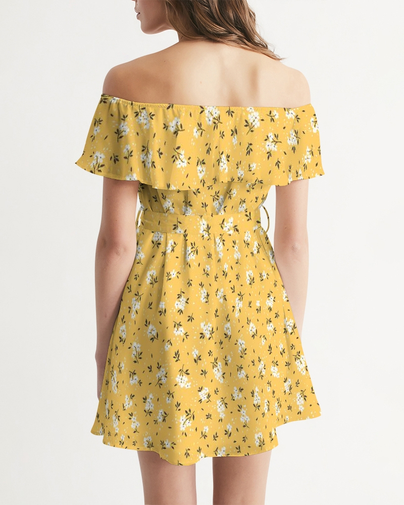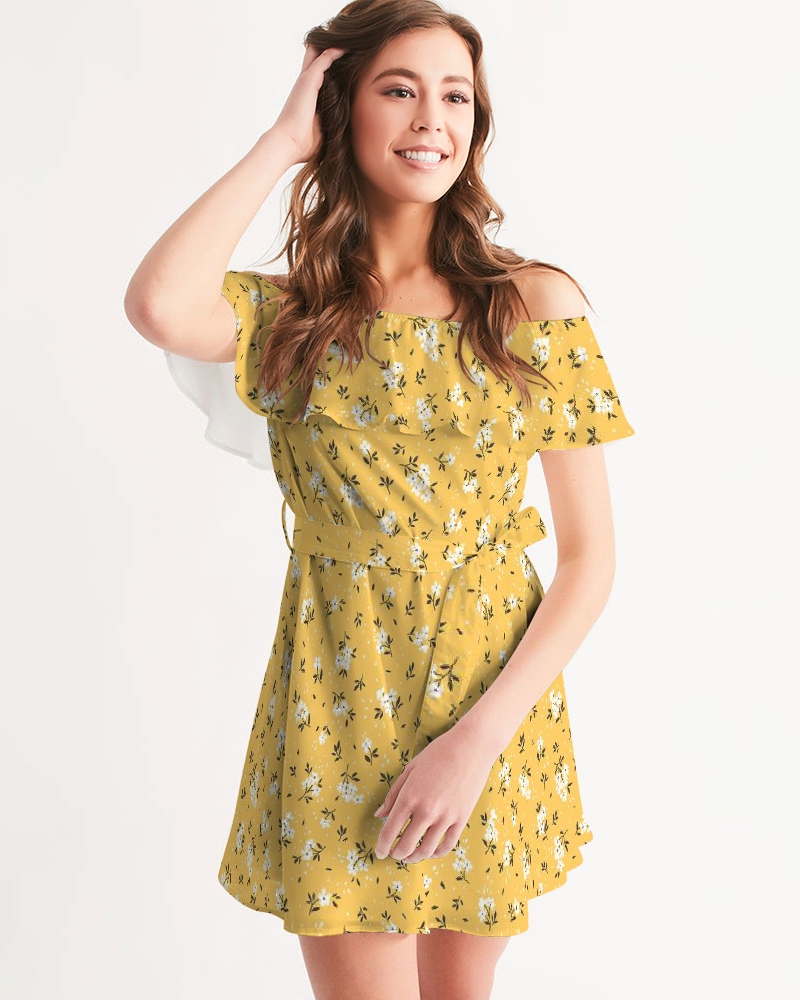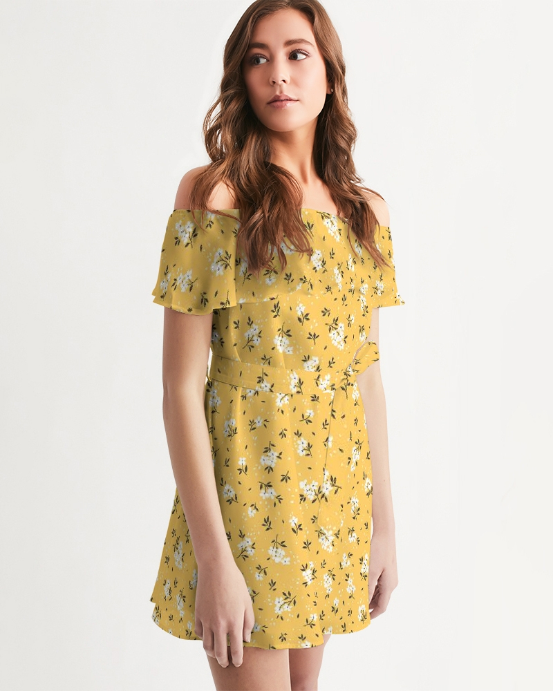 With a beautifully ruffled neckline, you will look effortless in our Women's Off-Shoulder Dress. Sheer chiffon is adorned with smocked detailing, a ruffled hem, and topped off with an adjustable belted waist tie detail.